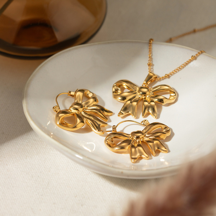 Nova joia banhada a ouro 18K acessórios femininos personalidade gravata borboleta colar brincos conjunto de joias de aço inoxidável